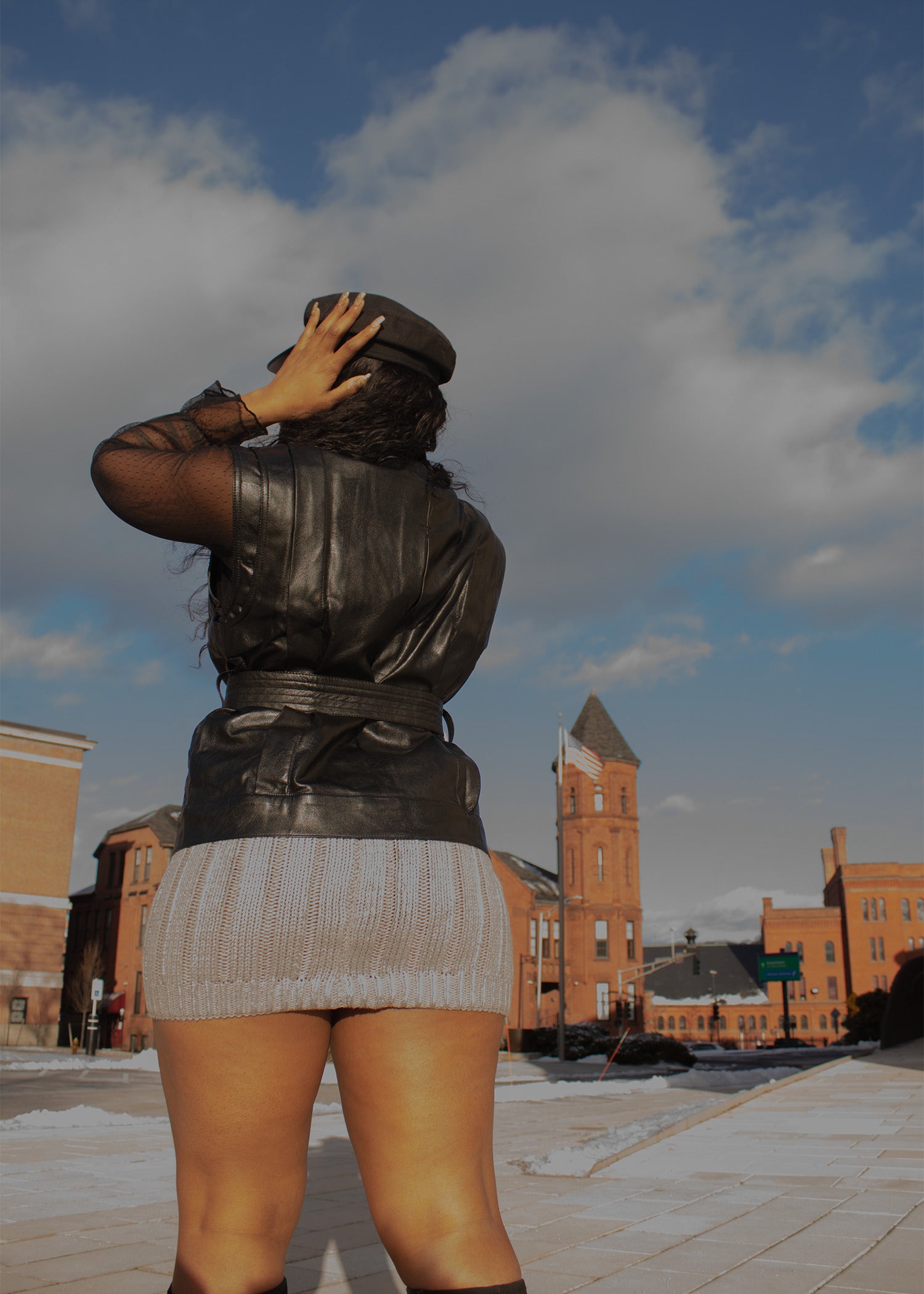 POWER SHOULDER LEATHER VEST FEATURES HIDDEN ZIPPER AND SNAP BUTTONS FOR CLOSURE. COLLAR. BELTED. SIDE POCKETS.